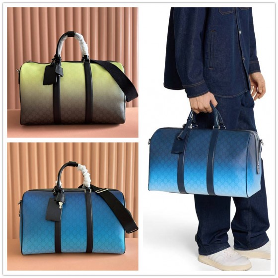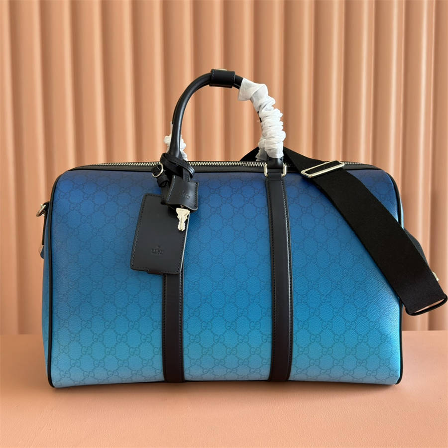HJK 配全套原厂专柜礼品袋包装【新品】别开生面的蓝色调渐变效果印花为这款基础功能单品倍添时尚美感。这款旅行包选用GG Monogram涂层织物制作,通体渐变GG印花尽显设计匠心。