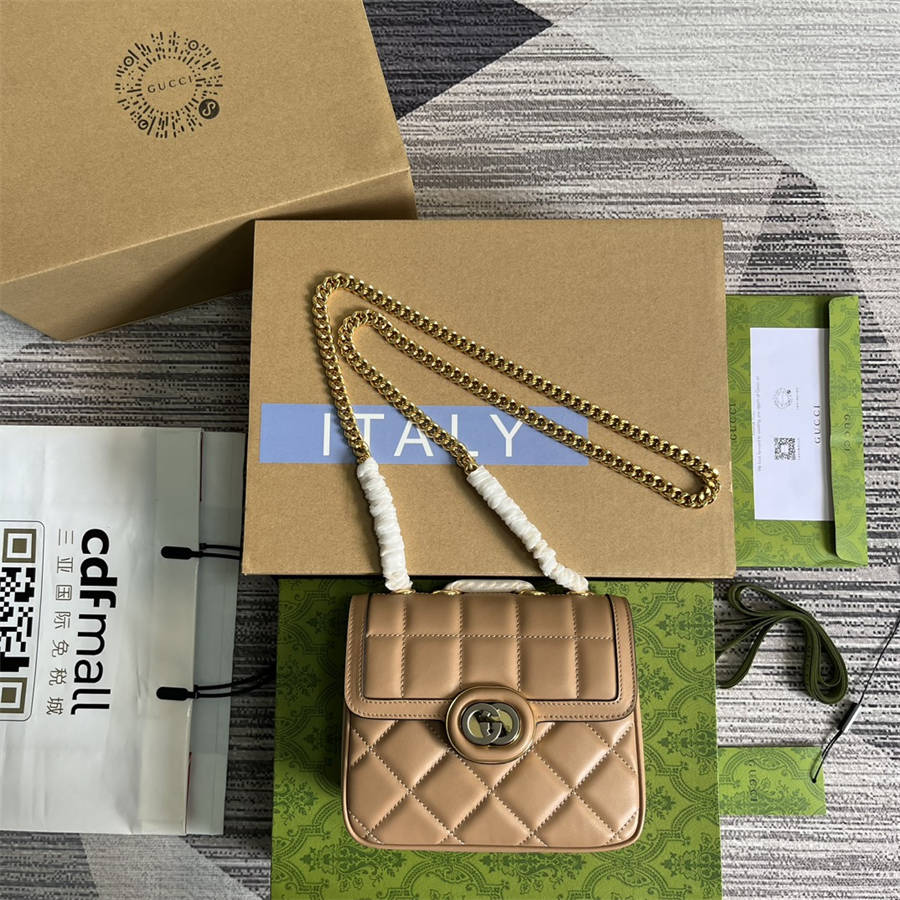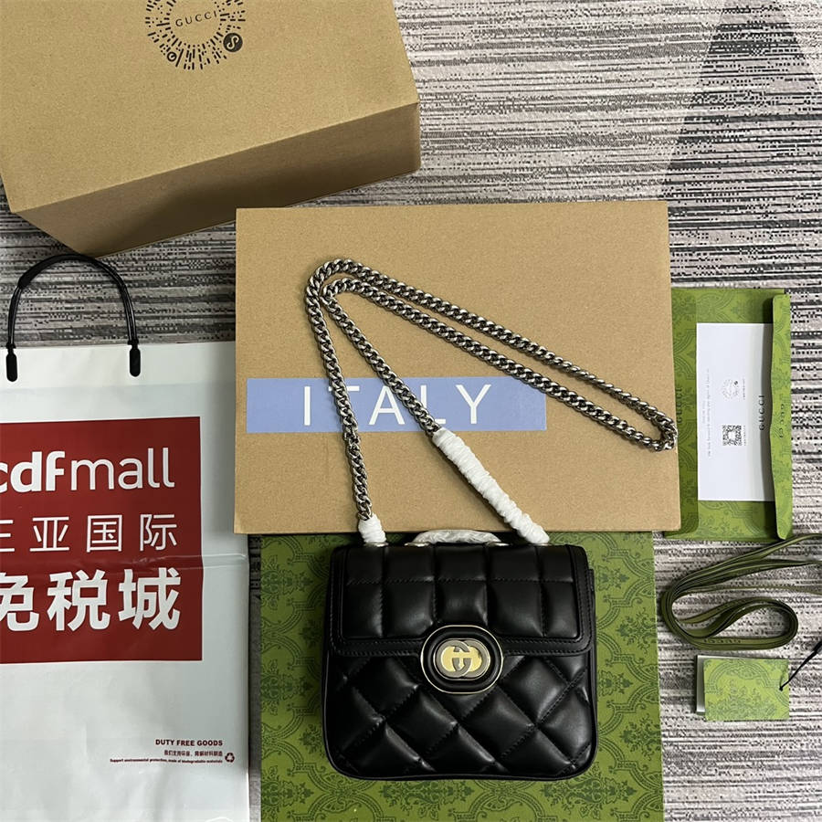 HKK(配全套包装)Gucci Deco系列mini肩背包Gucci不断拓展自身视野,以全新手法焕新演绎经典廓形和精致面料,同时彰显对过往年代的热爱之情。这款全新肩背包采用绗缝设计,巧妙融入源自品牌典藏设计的标志性符号,例如翻盖开合上的互扣式双G配件、20世纪70年代风皮革滚边以及链式肩带,散发出浓郁的复古气息。尺寸:18*14.5*8型号:741457