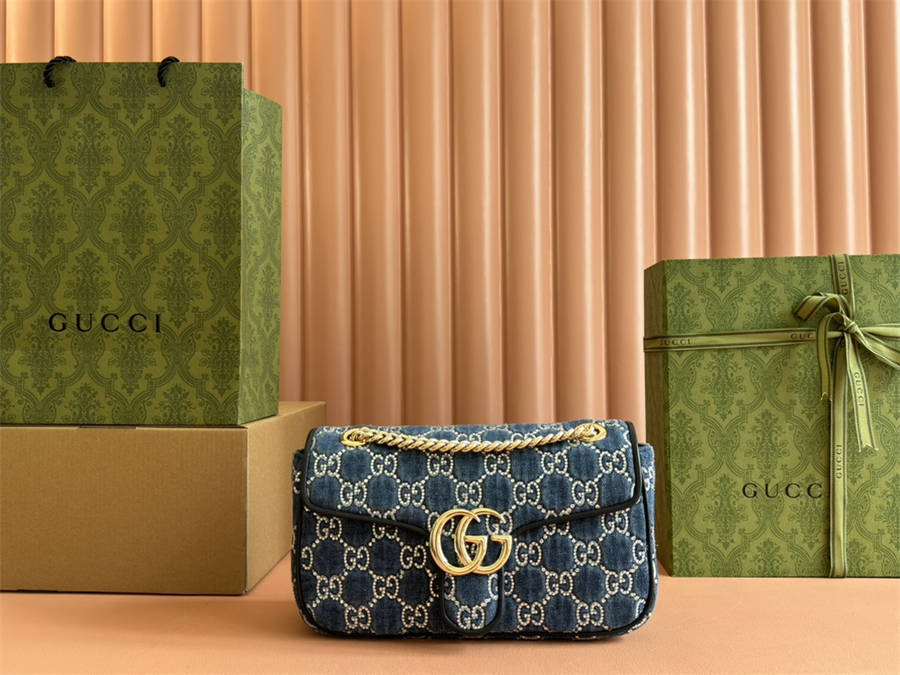 GKK【配置专柜全套包装】GG Marmont系列牛仔小号肩背包443497这款单品出自Gucci Lido系列,设计灵感源自意大利海岸的夏日风情和海滩俱乐部。这款GG Marmont系列小号链条肩背包采用柔和而不失挺括的结构设计,配以饰有双G造型配件的超大号翻盖扣。滑链肩带设计精巧,背法多样,可在肩背和手提之间自由转换。采用蓝色GG牛仔面料匠心制作,深蓝色滚边更添精致点缀。