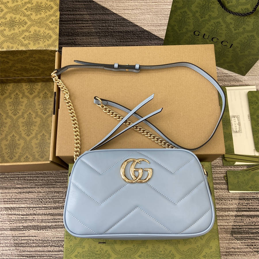 GG Marmont系列以清新色调演绎精致皮革,展现早秋魅力风范。这款小号肩背包采用绗缝V型皮革匠心打造,饰以拉链开合,浅金色调配件与浅蓝色时尚廓形相映成趣。浅蓝色绗缝V型皮革,浅蓝色皮革滚边,浅金色调配件,浅蓝色桑蚕丝衬里双G,开口内袋,可调节链式肩带(60厘米高)。 也可作为斜挎包使用。拉链开合,配加长拉链头x重量:约0.394千克。