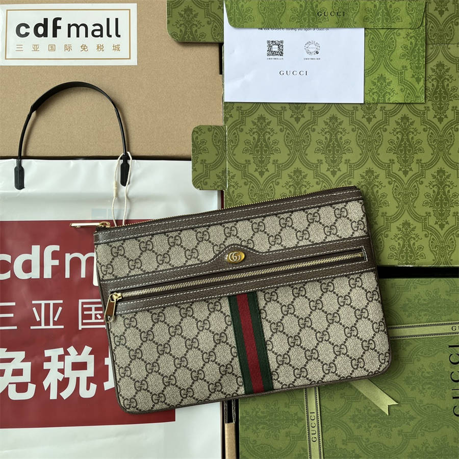 DBK【原厂皮配(Cdfmall三亚免税店手提袋】欧洲正品原单Ophidia系列高级帆布手拿包于1970年代开始使用标志性标识‼由始于早期标志性钻石菱格纹演化而来这款手拿包将标志性图案与条纹织带相结合尺寸:W29×H19cm。型号:517551pvc啡