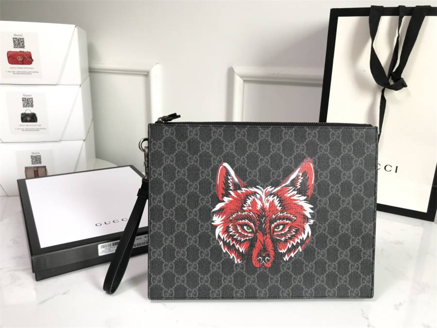 CJK【配置全套包装】 G家原单!正品开模制作,对版规格、对版内里做法,市场独家,印花GG 、图案已成为品牌标志之一,印花装饰于此款手包的中央!可拆卸意大利皮制腕带!内里侧面底部均顶级牛皮制作而成型号:547084,颜色:黑PVC狼头,尺寸:28*22*3.5