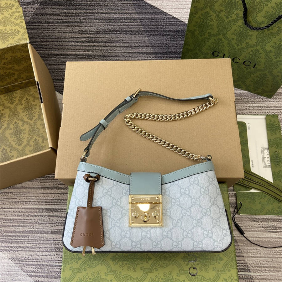 这款小号肩背包以品牌手工行李箱工作室起源为灵感来源,采用灰粉色GG Supreme帆布打造,亮眼呈现挂锁式锁扣开合,搭配灰粉色皮革滚边和全新可调节皮革链条肩带。浅金色调配件和皮革钥匙扣令整个设计魅力倍增。
