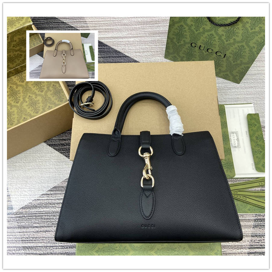 这款中号托特包沿用首次亮相于2024春夏系列的弹簧钩扣开合设计。黑色皮革呈献别致的天然粒纹,尽显精致风范。这款手提包采用钩扣开合包带开口隔层设计,搭配可拆卸和可调节肩带。