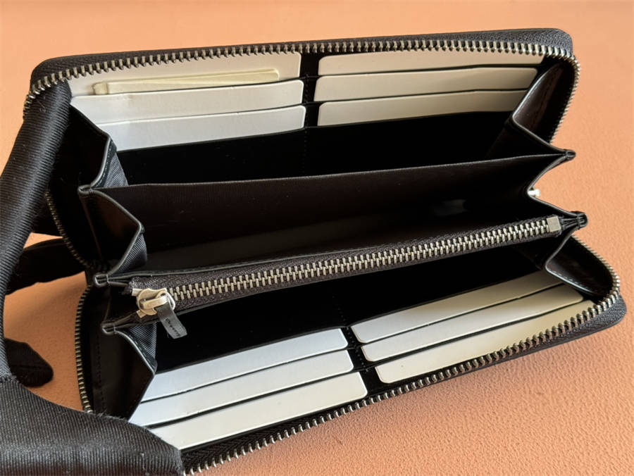 内部:十二个卡片隔层、三个钞票隔层和一个拉链零钱袋