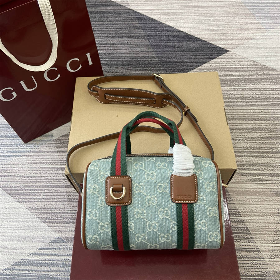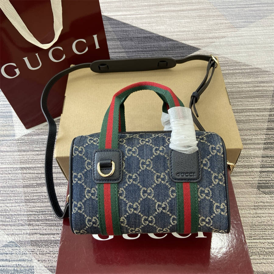 EIK【配全套专柜包装】品牌甄选GG迷你手袋灵感源自Gucci标志性旅行包的造型风格。这款手袋采用丹宁面料匠心打造,配有条纹织带提手与可拆卸肩带,焕新演绎品牌经典元素,致敬品牌在旅行箱包领域的悠久传承。