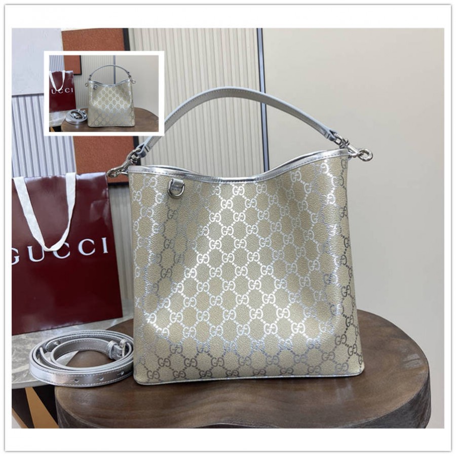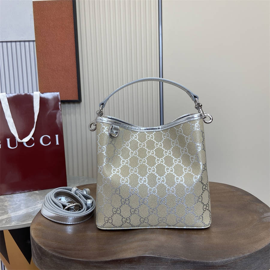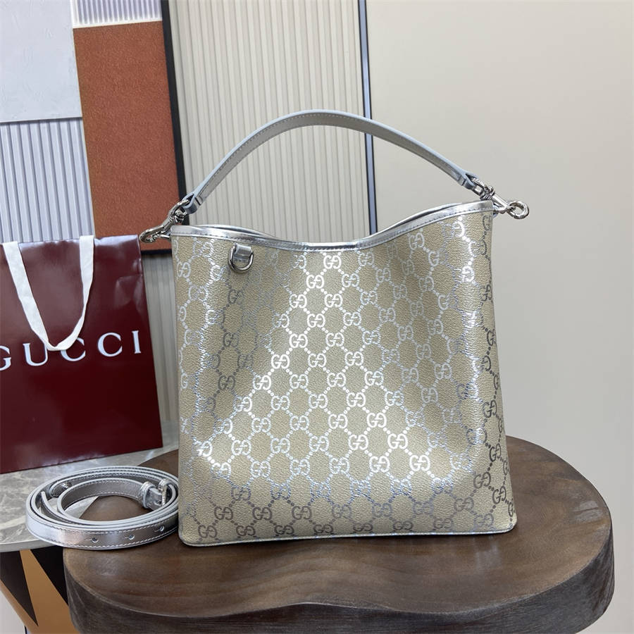 浅米色和银色金属质感层压效果GG字母交织图案涂层织物