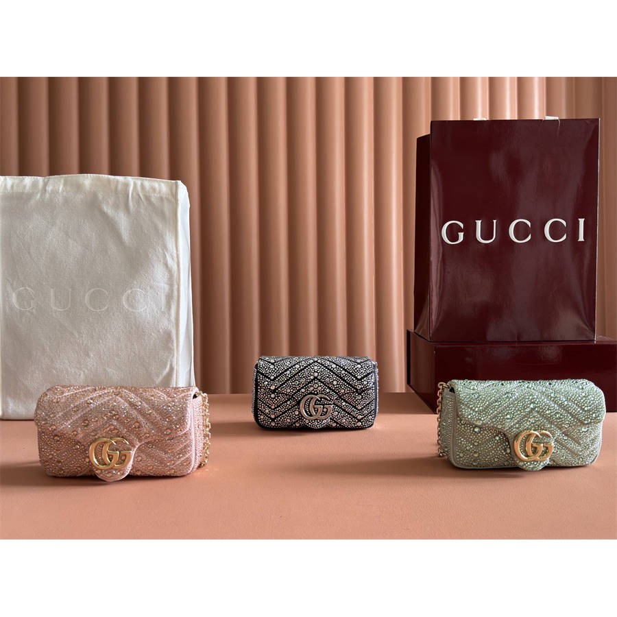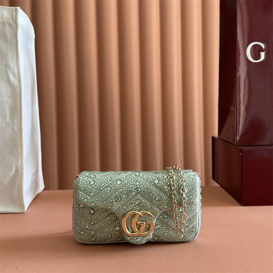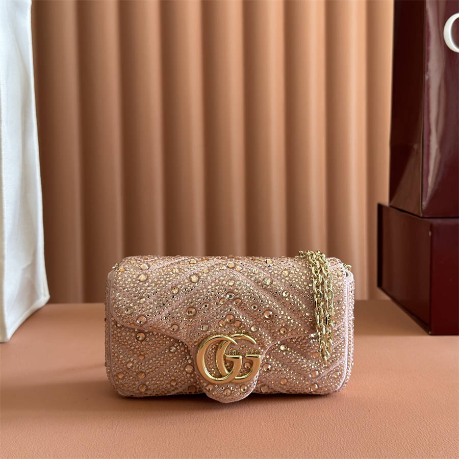 FKK【配全套原厂专柜包装】品牌标志性GG Marmont系列匠心融蕴双G造型配件和切面链式包带,甄选牛巴革缔就柔软廓形,配以夺目仿水晶,更添亮眼格调。