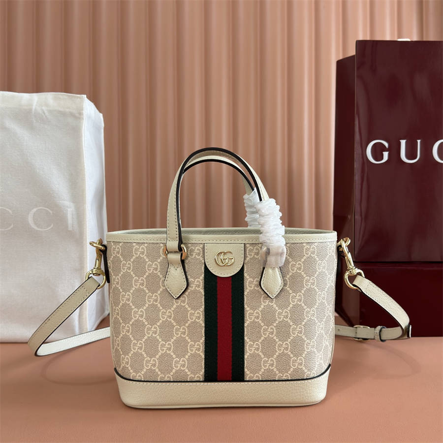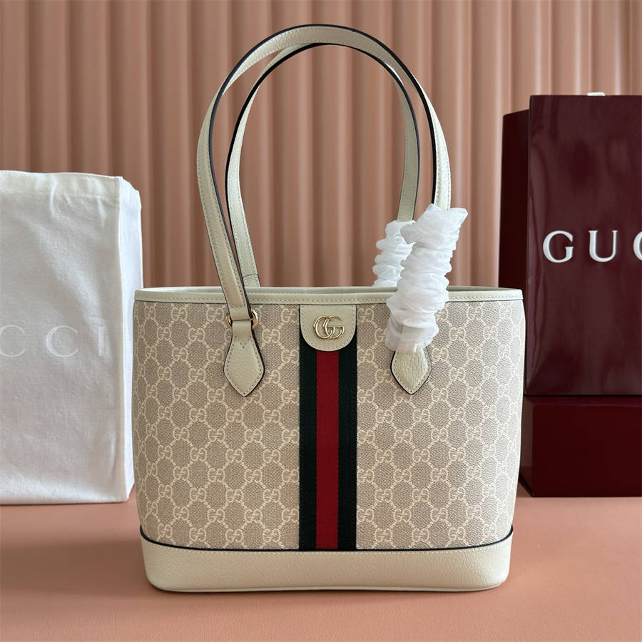 FBK FDK【配全套原厂专柜包装】Ophidia系列以标志性条纹织带与浅金色调双G元素致敬品牌传承。这款托特包以白色GG字母交织图案涂层织物匠心打造,配有顶部提手和一根肩带,采用绿色棉质衬里。